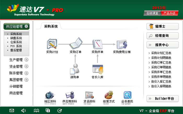《速達(dá)V7-PRO-工業(yè)版》作為高端ERP管理平臺,特別適合大中型企業(yè)使用。平臺全面實(shí)現(xiàn)供應(yīng)鏈業(yè)務(wù)管理、生產(chǎn)管理、資金管理、財務(wù)管理、客戶關(guān)系管理、人力資源管理、辦公管理、異地分銷、遠(yuǎn)程配送、多機(jī)構(gòu)集團(tuán)化管理。平臺通過強(qiáng)化業(yè)務(wù)流程控制,多級審批管理,有效地幫助企業(yè)實(shí)現(xiàn)業(yè)務(wù)管理、生產(chǎn)管理、財務(wù)管理的制度化。平臺科學(xué)地融入Builder-Ⅲ二次研發(fā)工具,真正實(shí)現(xiàn)了產(chǎn)品平臺化,滿足企業(yè)管理個性化需求,全面提升企業(yè)管理的能力。
