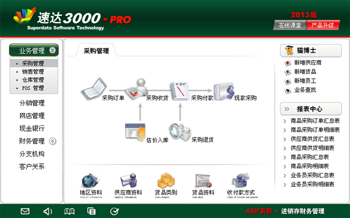 《速達(dá)3000G-PRO商業(yè)版》集進(jìn)銷存、POS、財(cái)務(wù)、CRM為一體的中小企業(yè)管理軟件系統(tǒng)。系統(tǒng)采用導(dǎo)航式界面,易學(xué)易用、功能強(qiáng)大,是幫助中小企業(yè)規(guī)范經(jīng)營管理、財(cái)務(wù)管理的有效工具。系統(tǒng)支持局域網(wǎng)/互聯(lián)網(wǎng)多用戶應(yīng)用,實(shí)現(xiàn)異地多機(jī)構(gòu)、多店面、多倉庫等遠(yuǎn)程應(yīng)用,支持Android移動(dòng)終端應(yīng)用,數(shù)據(jù)實(shí)時(shí)同步,安全、穩(wěn)定、高效、易維護(hù),特別適合中小企業(yè)使用。