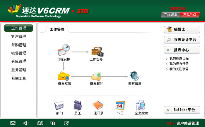 《速達(dá)V6-客戶關(guān)系管理-STD》作為速達(dá)V系列專業(yè)的客戶關(guān)系管理平臺,特別適合中小企業(yè)使用。產(chǎn)品全面整合客戶管理、工作管理、市場推廣、進(jìn)銷存管理、移動應(yīng)用等管理環(huán)節(jié),幫助企業(yè)建立完善的客戶關(guān)系管理平臺,充分挖掘客戶潛力,實現(xiàn)企業(yè)利益最大化。平臺科學(xué)地融入Builder-Ⅲ二次研發(fā)工具,真正實現(xiàn)了產(chǎn)品平臺化,滿足企業(yè)管理個性化需求,為企業(yè)提供全新的一體化客戶關(guān)系管理解決方案。
