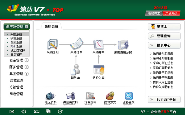 《速達V7-TOP-商業(yè)版》作為高端ERP管理平臺,特別適合大中型企業(yè)使用。平臺全面實現(xiàn)供應(yīng)鏈業(yè)務(wù)管理、進出口管理、質(zhì)量管理、資金管理、財務(wù)管理、客戶關(guān)系管理、人力資源管理、辦公管理、異地分銷、遠程配送、多機構(gòu)集團化管理。平臺通過強化業(yè)務(wù)流程控制,多級審批管理,有效地幫助企業(yè)實現(xiàn)業(yè)務(wù)管理、財務(wù)管理的制度化。平臺科學(xué)地融入Builder-Ⅲ二次研發(fā)工具,真正實現(xiàn)了產(chǎn)品平臺化,滿足企業(yè)管理個性化需求,全面提升企業(yè)管理的能力。