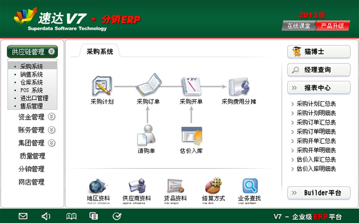 《速達(dá)V7-分銷ERP-商業(yè)版》是一款集進(jìn)銷存管理、財(cái)務(wù)管理、分銷管理、CRM管理、OA管理為一體的分銷管理解決方案,平臺(tái)滿足現(xiàn)代企業(yè)經(jīng)營環(huán)節(jié)、機(jī)構(gòu)類型、生意模式多樣化的特征,突出了對(duì)營銷體系的分散式管理和分銷控制。產(chǎn)品通過互聯(lián)網(wǎng)將企業(yè)總部與代理商、分銷商科學(xué)地聯(lián)系在一起,實(shí)現(xiàn)實(shí)時(shí)地提交業(yè)務(wù)單據(jù)、查詢產(chǎn)品供應(yīng)和庫存、獲得市場銷售信息及客戶資源。為企業(yè)的業(yè)務(wù)經(jīng)營與合作提供了全新的管理模式。